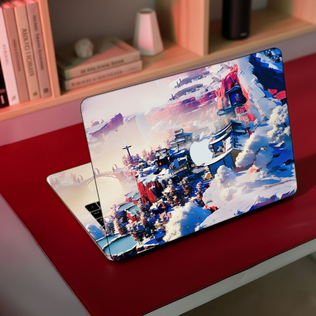 Transport your device to a serene winter wonderland with this exquisite mobile skin featuring a traditional Japanese snow village. The design captures a breathtaking 3D-effect landscape of snow-capped temples, vibrant red cliffs, and frost-covered trees against a crisp blue sky. This stylish skin is more than an artistic statement; it acts as a premium protective skin, shielding your laptop or gadget from surface scratches, dust, and daily wear while keeping the profile slim and elegant.