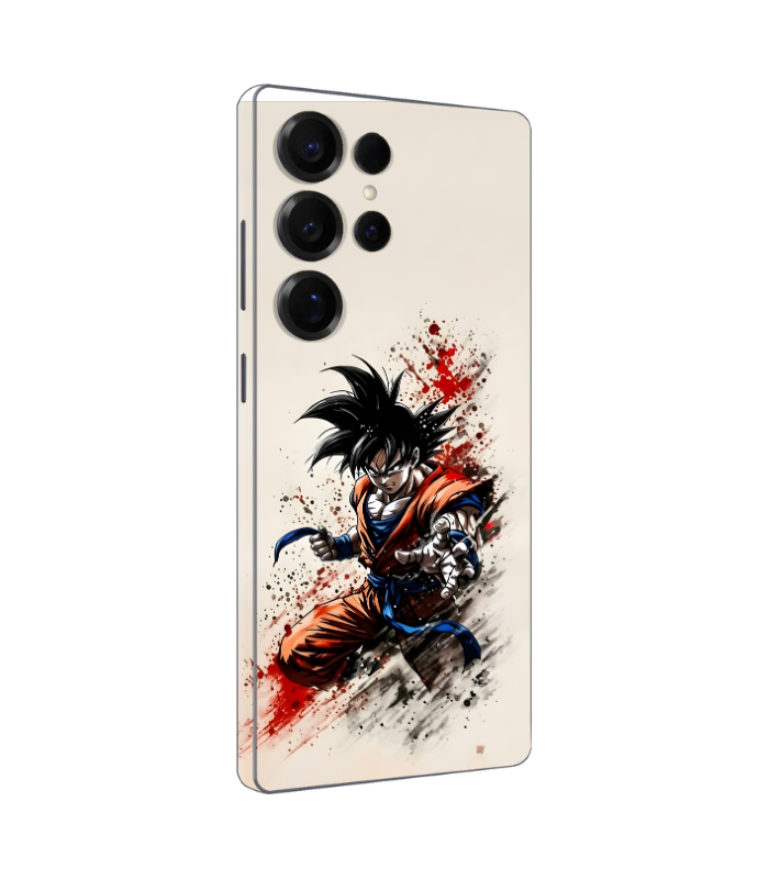 Unleash your inner Saiyan with this electrifying mobile skin featuring high-intensity anime splatter art. This skin wrap showcases a legendary warrior in a powerful battle stance, accented by bold red and black ink splatters on a clean, off-white background. It is the perfect stylish skin for fans who want to combine their love for iconic anime with a modern, artistic edge.
