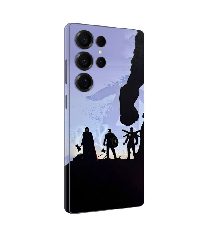 Unleash the hero within with this epic, cinematic mobile skin featuring the iconic silhouettes of legendary superheroes. Set against a moody, light blue sky with a large, looming fist graphic, this design captures the ultimate team-up vibe in a sleek, minimalist style. This mobile wrap is a must-have for comic book fans and movie buffs who want to showcase their passion with a professional, “less is more” aesthetic.
