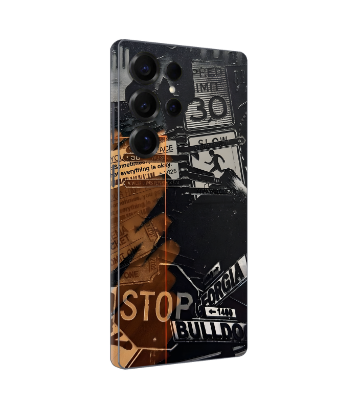 Embrace the raw energy of the city with our Urban Street Graffiti Collage Mobile Skin. This high-definition mobile wrap features a dynamic montage of street signs, “Stop” indicators, “Slow” warnings, and industrial typography layered in a gritty charcoal and warm amber palette. It is the ultimate skin wrap for those who love underground aesthetics, city vibes, and textured, collage-style art that makes a bold statement.